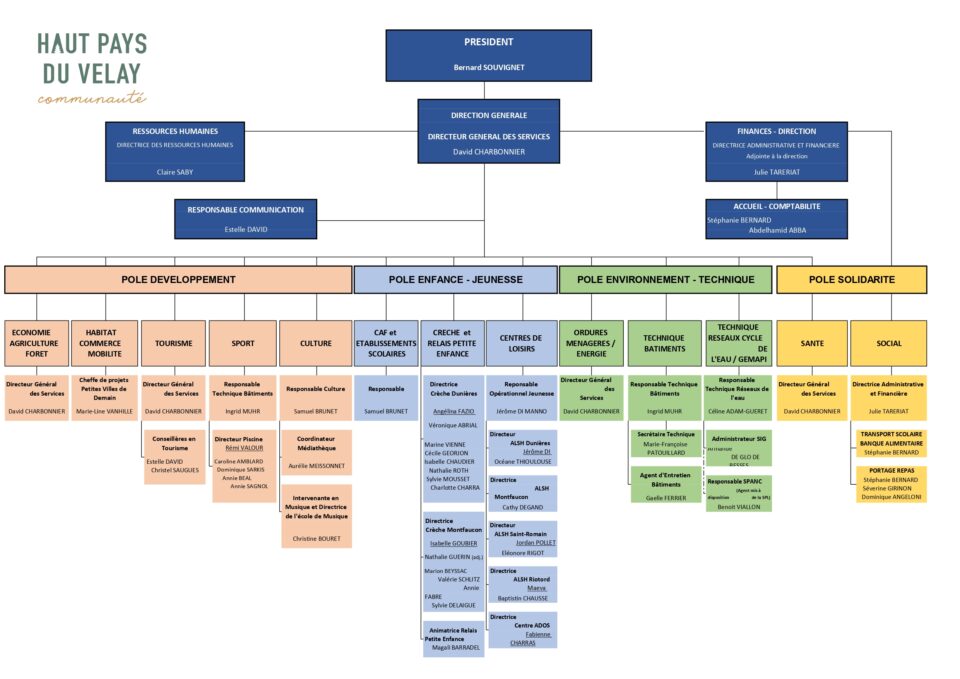 Descendre vers le contenu Haut Pays du Velay communautéCommunauté de communesPersonnel Personnel La Communauté de Communes emploie actuellement 45 personnes (agents dans la collectivité + agents mis à disposition par une autre collectivité) au sein des différents services de la collectivité. Retrouvez l’ensemble des services et du personnel en consultant l’organigramme en PDF.